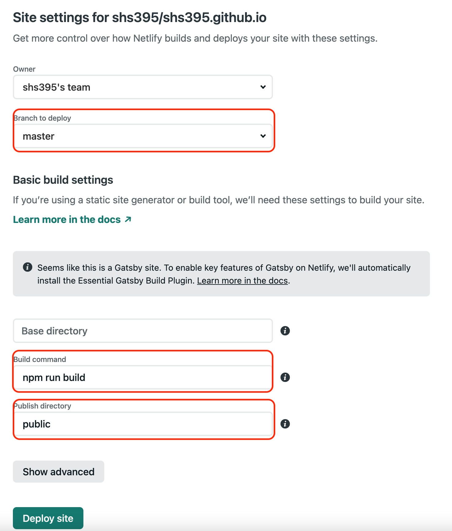 후에 Deploy site 버튼을 눌러주면 build 후에 deploy 된다.