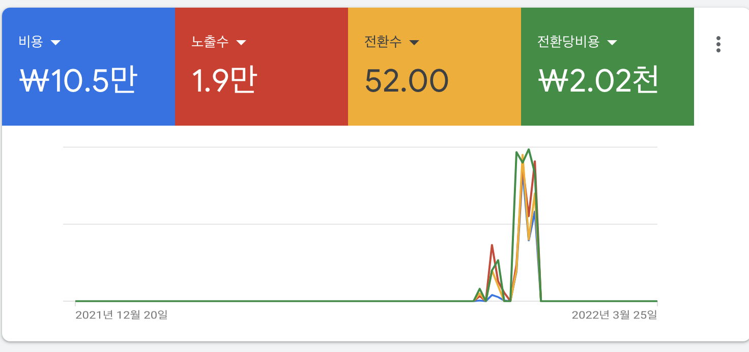 그런데 광고 최적화가 안좋은건지 대한민국 광고 단가가 비싼지 1전환당 2000원 정도 나왔다.