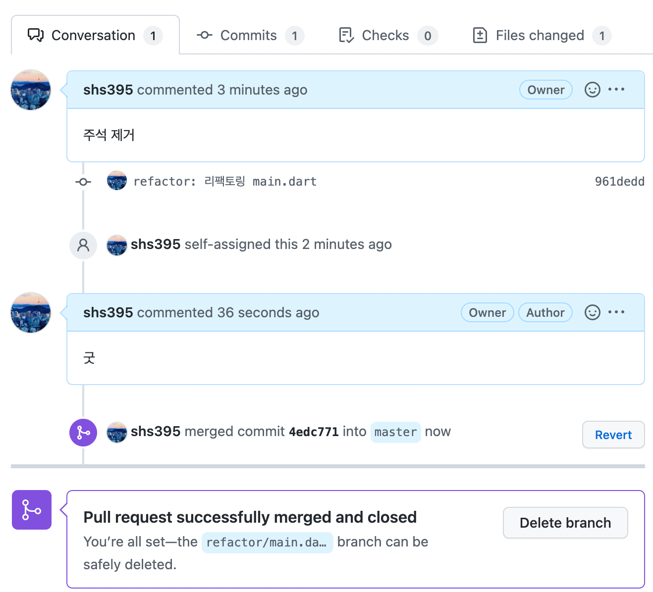 - merge 되었다면 브랜치를 삭제한다.