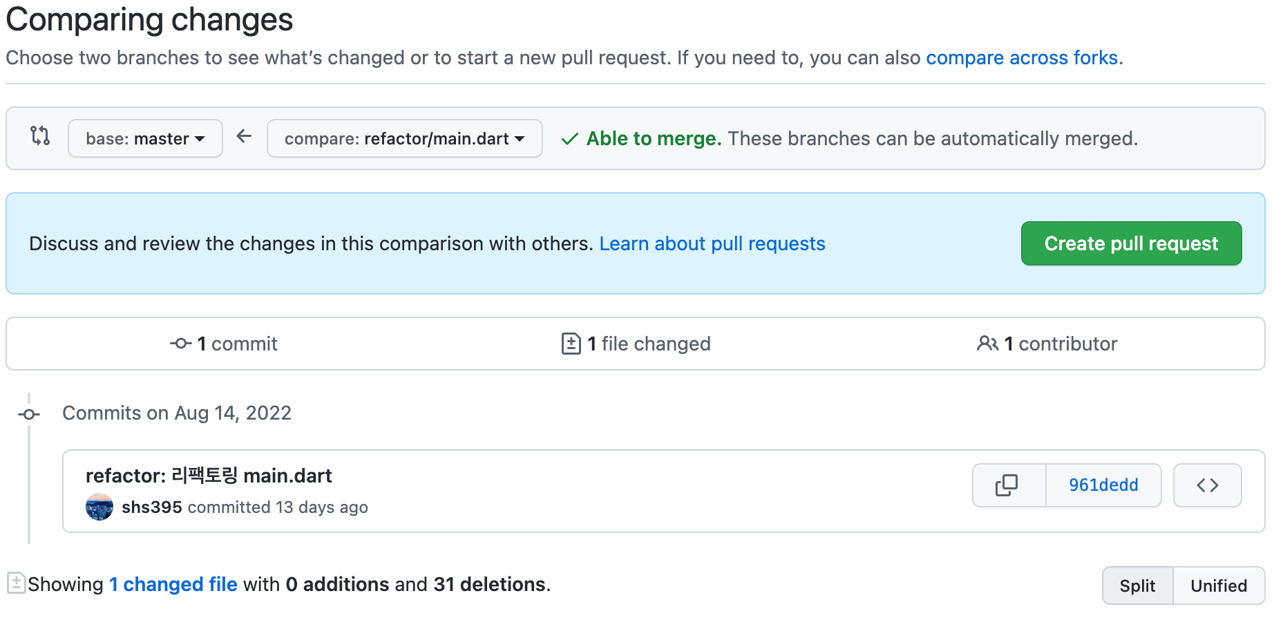 이런 식으로 변화를 비교하고 pull request를 생성할 수 있다.