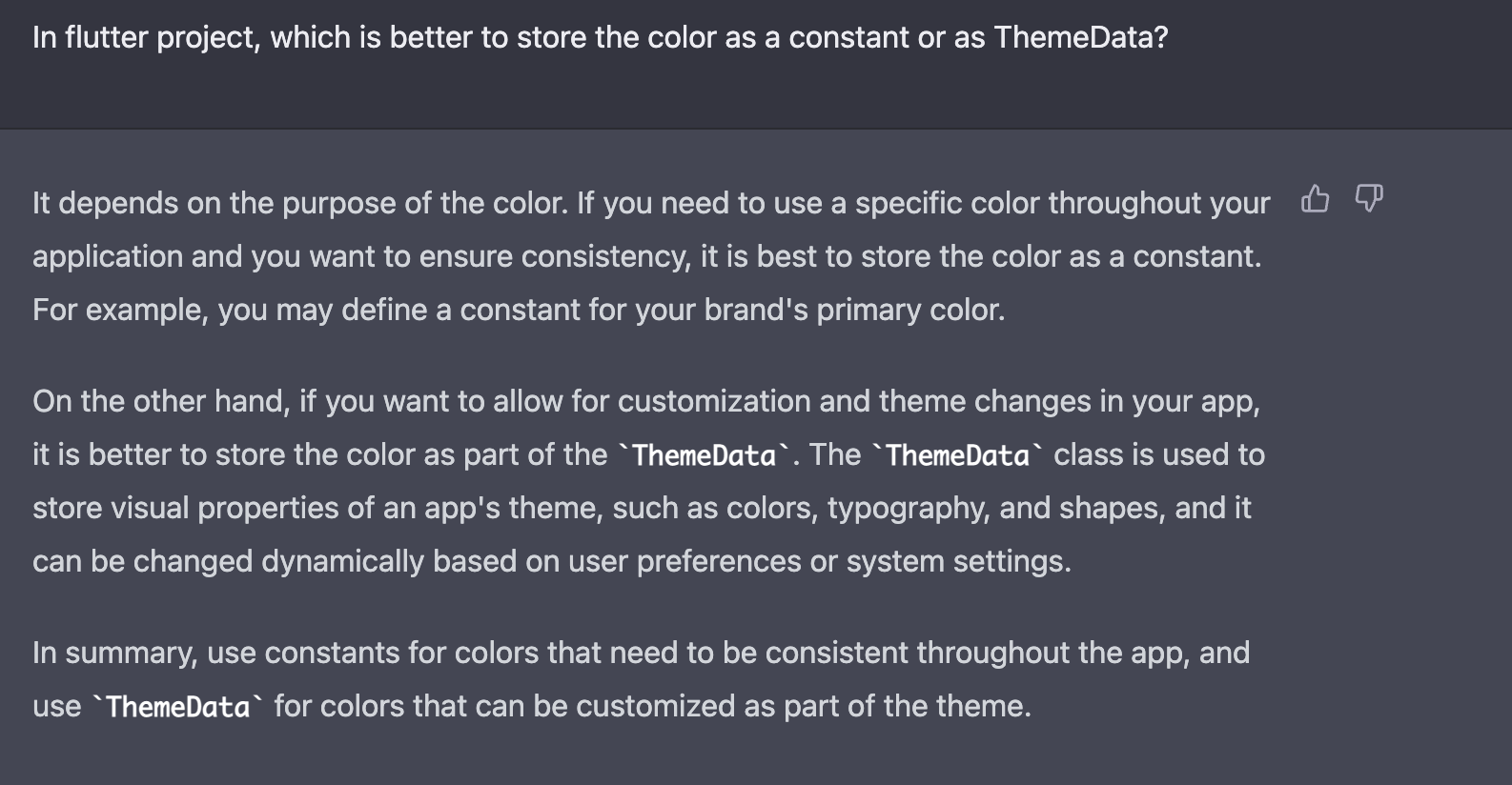 후에 라이트모드 / 다크모드 지원 혹은 유저에 의한 색 변경 기능까지 생각하면 ThemeData를 쓰는게 맞는 것 같다.