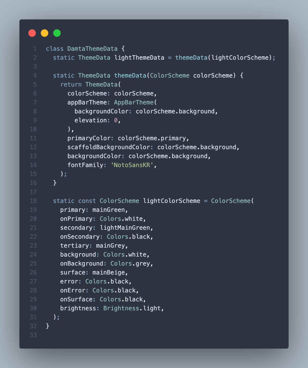 자주 사용하는 상수가 있는 colors.dart와 ColorScheme을 이용하여 만든 themeData로 구성된다.
