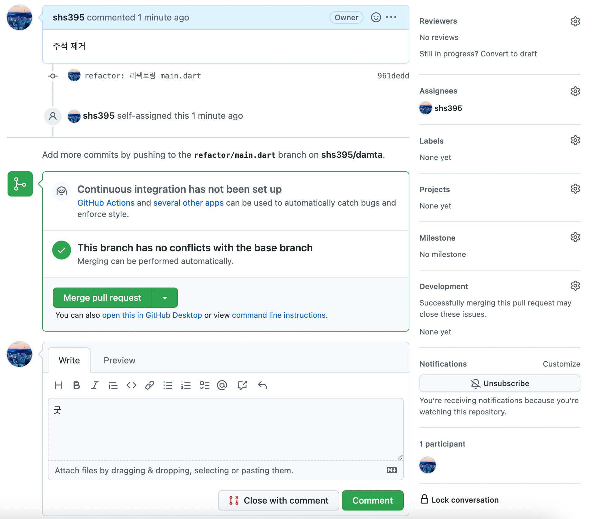 댓글도 달아보고 merge pull request 버튼을 눌러준다.