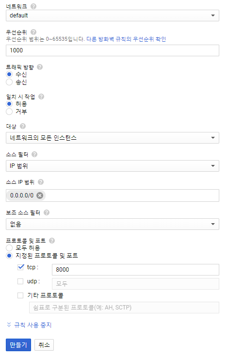 google cloud platform 같은 경우에는 먼저 gcp 자체의 방화벽 설정을 해주어야한다.