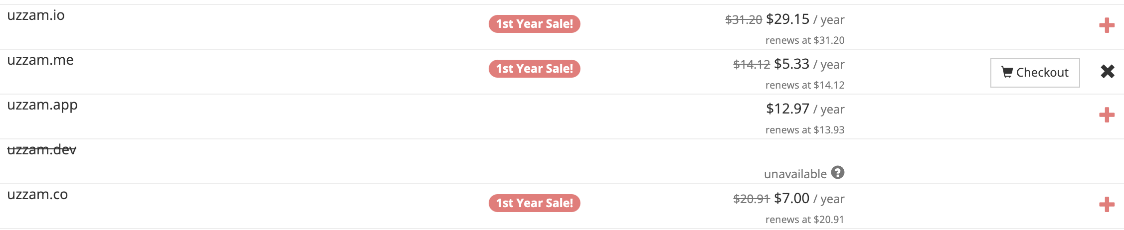 2. 가격을 확인 후 원하는 도메인에서 오른쪽에 있는 + 버튼을 누르면 나오는 checkout 을 눌러 결제한다.