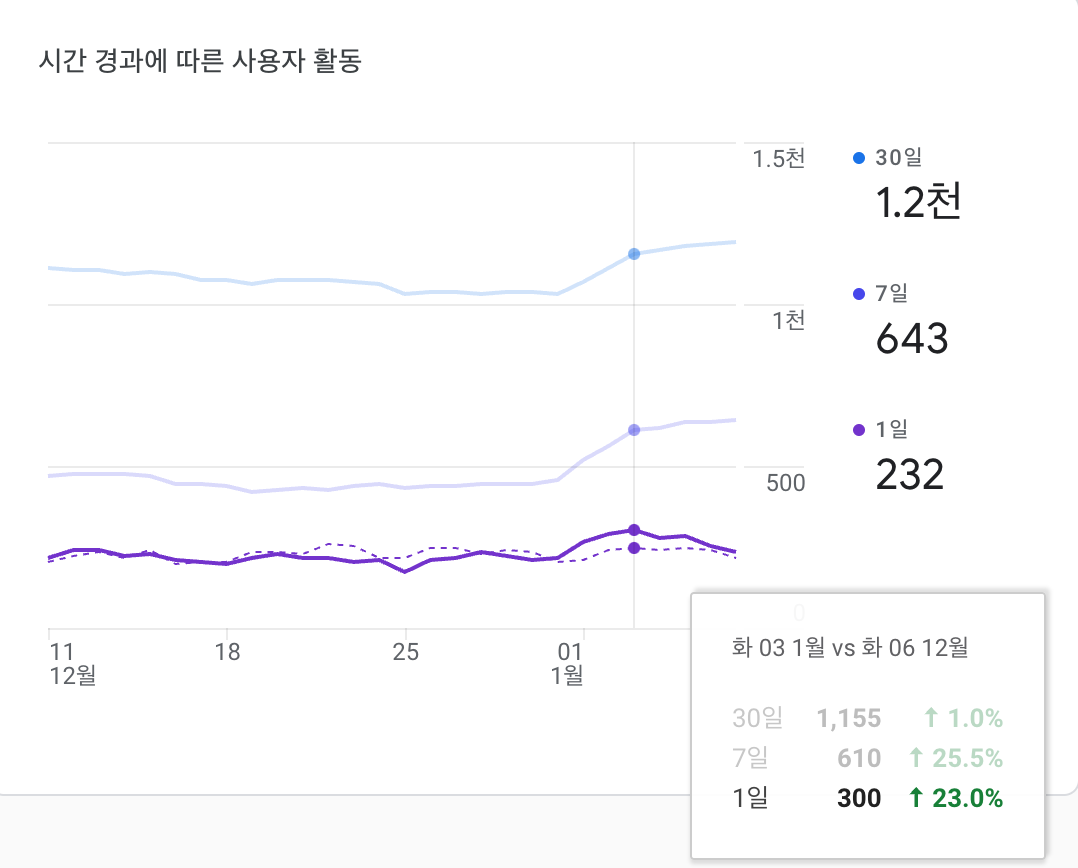 200 초반을 유지하던 DAU도 1월 3일에는 300명을 기록했다.