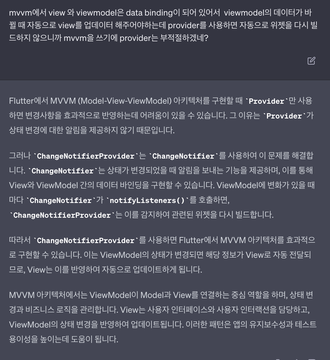 즉, Provider 보다는 ChangeNotifierProvider가 MVVM에 알맞다고 추측해볼 수 있다.